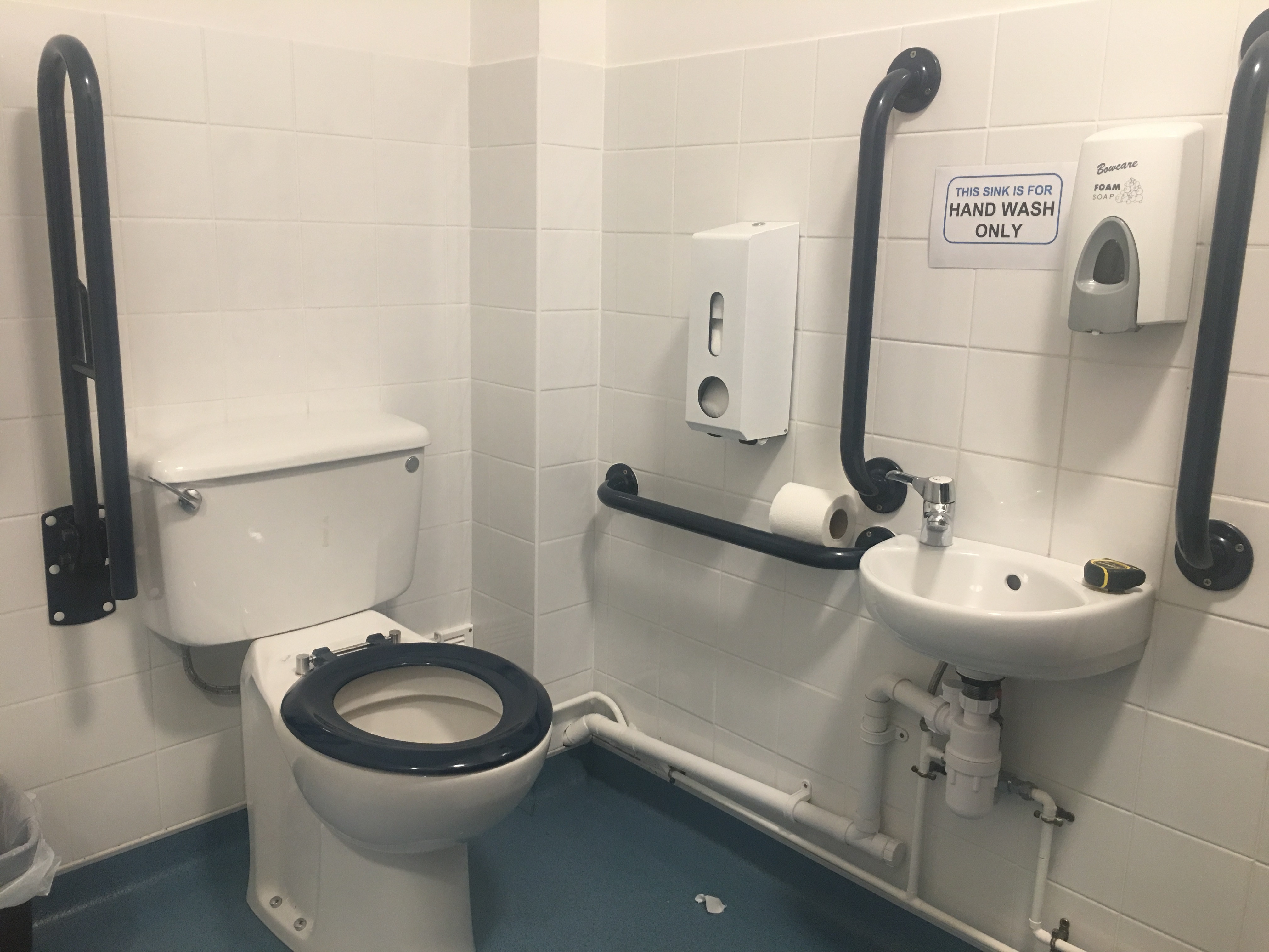 The dimensions of the room for the female accessible toilet is slightly under minimum requirements however there is space for a wheelchair and an assistant. The doorway is just short of minimum requirements with a width of 920mm. The door is lightweight with an easy to use lock, however there is no coat hook on the inside.